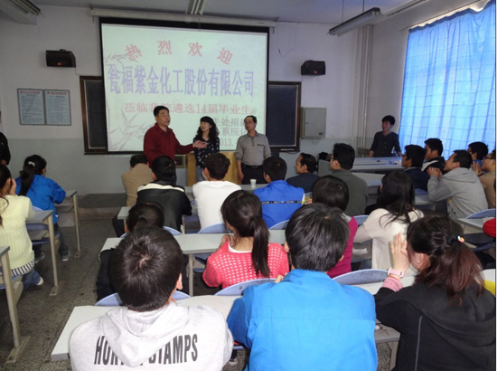 4月24日,福建瓮福紫金化工股份有限公司人力资源部陈晓宇经理、生产部柳经理等一行2人来我院石油化学工程系遴选毕业生。24日中午12点半在石化系化工楼201教室举行了企业宣讲报告会,石化系、应化系、机械系、人文系等相关专业的14级100多名未就业学生到场聆听了此次报告会。石化系党总支书记呼小洲、政治辅导员于爱平、应化系政治辅导员王舜平等领导参加了此次报告会。
