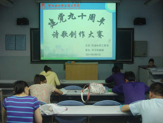 为了庆祝建党九十周年,弘扬中国传统诗文化,展现当代大学生的风采,6月2日晚,石油化学工程系在化工楼201教室举办了“建党九十周年”诗歌创作大赛。本次比活动得到了同学们的广泛关注与参与,截止参赛当日共有来自各班的56名参赛选手参赛。