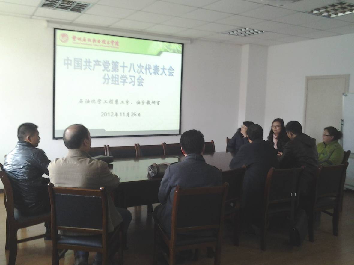 11月26日下午,石油化学工程系各教研室在教师备课中心认真组织学习、宣传了党的十八大精神,会议由各教研室主任主持。