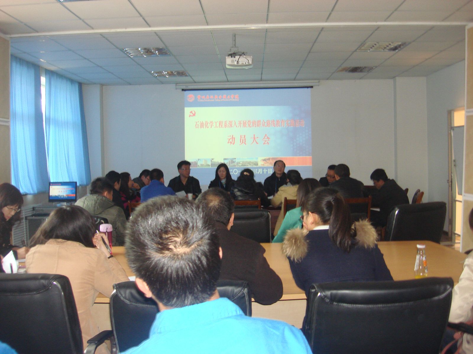 根据中央和省委关于在全党深入开展以为民务实清廉为主要内容的党的群众路线教育实践活动的统一部署,按照学院《深入开展党的群众路线教育实践活动实施方案》的要求,3月10日下午,石油化学工程系党总支在学院东区教师备课中心召开了党的群众路线教育实践活动动员大会,对全系教育实践活动进行了动员部署。学院教育实践活动第一督导组副组长周定潮、联络员陈金平、石化系领导、全系教工党员、教师代表、学生党员代表参加了动员大会,大会由冯文成主持。