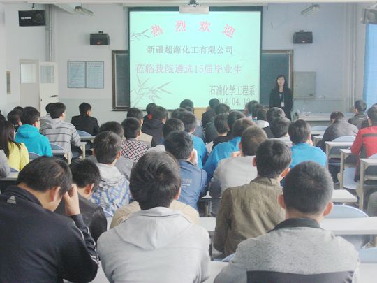4月12日,新疆超源化工有限公司赵总、人力资源部马主任等一行2人来我院石油化学工程系遴选毕业生。12日上午十点,在石油化学工程系化工楼201教室举行了企业宣讲报告会,石化系及其它各系的2015届毕业生共60多人到场聆听了此次报告会。石化系党总支副书记唐蓉萍等领导参加了此次报告会。