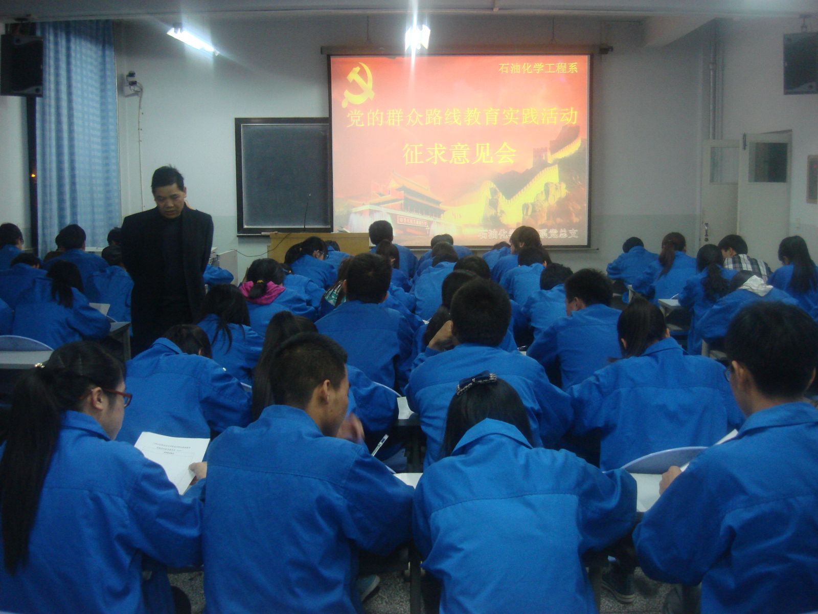 为深入贯彻落实学院关于开展党的群众路线教育实践活动的部署和要求,扎实推进群众路线教育实践活动工作,同时为了了解同学们在日常生活中遇到的困难,解决我系同学所关心的焦点问题,加强我系学风建设。4月20日晚7点半,石油化学工程系学生党员于化工楼209教室组织开展党的群众路线教育实践活动征求意见会。本次会议由系辅导员李胜泥主持。石化系12级预备党员共计80人参加了此次大会。
