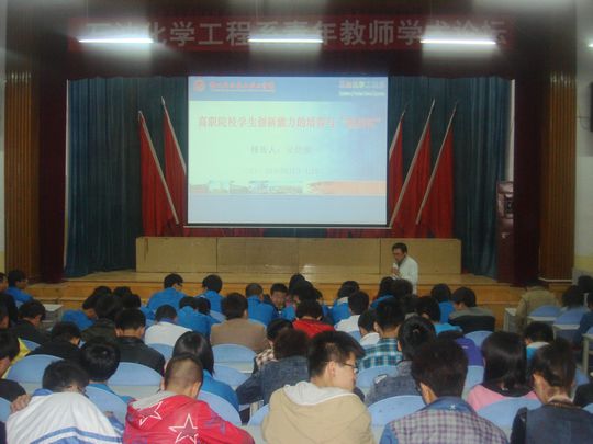 为引导和激励广大学生积极参与科技实践,锻炼学生科研创新能力,树立学生创业观念和创新意识,促进学生科技活动的深入开展,并挖掘和培养一批有潜力的优秀人才,同时,为了实施我系拔尖人才培养的其中一项举措,石油化学工程系于4月17日晚在西阶一教室举办了夏德强主讲的以“高职院校学生创新能力的培养与挑战杯”为主题的报告会,正式拉开了石化系青年教师学术论坛的序幕,石化系青年教师和近300名学生参加了本次论坛。本次报告会通过海报进行广泛宣传,由青年教师和学生自愿参加,目的在于营造学生自主探索、发挥学生主观能动性的校园文化氛围。