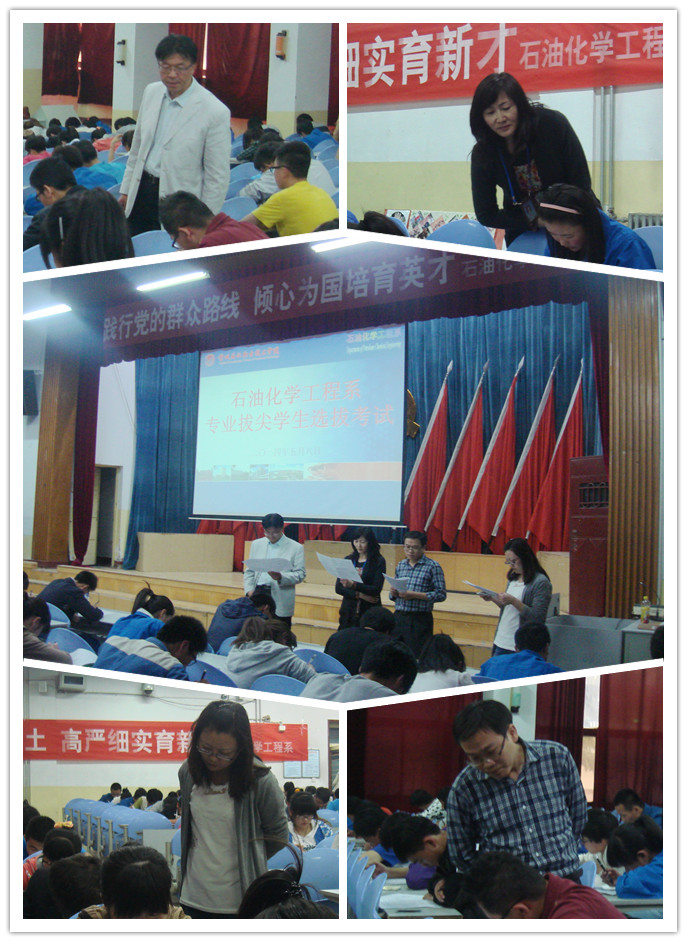 为了大力推进石化系拔尖学生培养计划,巩固基础知识,进一步加强我系学风建设,提升学生的综合能力及素质,5月8日晚七点,石油化学工程系举办了专业拔尖学生选拔考试,由石化系2013级各班排名前十的同学共计150余人参加了此次考试,考试开始后石化系主任冯文成、系党总支副书记唐蓉萍、副主任李薇、系党总支副书记夏德强等巡视了考场,系教学秘书李晓莹、辅导员史晓庆、系专业老师于娇娇等三人进行监考。