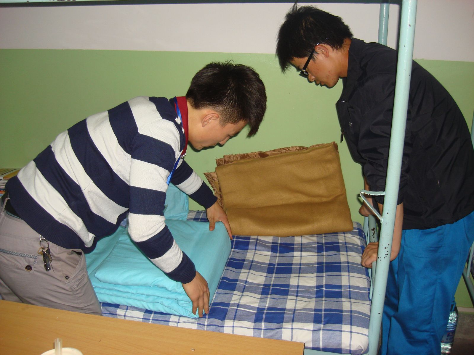 石化系新生住宿分散,条件不一。军训教官首先对新生做了宿舍内务整理重要性的教育,教官教导学生:内务整理是完成军训要做的重要内容,是军人具备的基本素质,是煅炼军人严于纪律、服从命令、勇敢果断、不畏艰苦、迎难而上作风的重要环节之一,同样适合于养成良好的学习生活习惯。军训教官针对各楼层不同条件制定了不同的内务标准及要求,从被褥叠放、书桌整理、鞋子摆放、毛巾晾挂、水杯牙刷朝向等方面进行了示范,手把手的教会学生折被子、整内务。达到新生宿舍内务统一、整洁有序。给新生日常行为和生活习惯提了严格的要求,要求同学们关爱集体、在集体生活中发扬团队精神;学会独立生活、在独立生活中成长进步。时刻保持严于纪律、艰苦朴素、勤奋学习、快乐成长的优良作风,鼓励学生每天的生活从整理内务开始,以饱满的热情投入到学习之中。