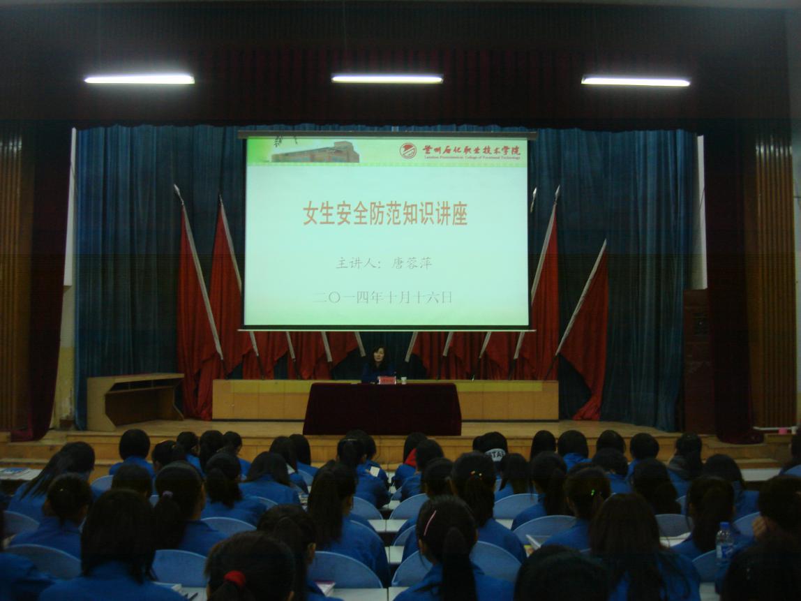 生为女性、长为女人,突出大学女生青春期心理特征;自尊自爱,自立自强,尽显石化系女生四自教育成果。10月16日晚,石油化学工程系在西阶一开展了以女生“四自”教育为主要内容的女生安全防范知识专题讲座,唐蓉萍担任主讲,石化系13、14级女生约300人参加了本次讲座。