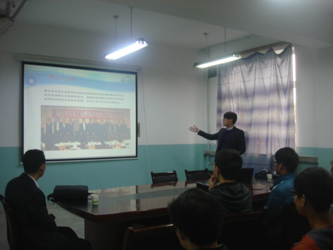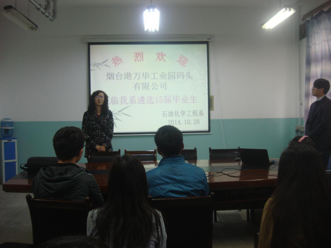 10月28日上午,烟台港万华工业园码头有限公司张总一行二人莅临石油化学工程系遴选2015届毕业生。石化系党总支副书记唐蓉萍、主管就业老师于爱平及12级未就业学生60余人参加了本次招聘宣讲会。会上,招聘人员就公司股东、公司文化、企业文化、薪酬福利等方面向大家进行了详细的介绍。会后,对该公司有意向的同学参加了面试。