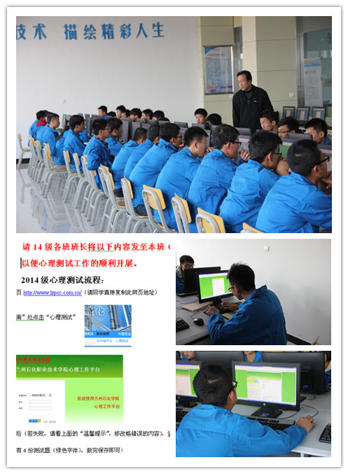 在学院新生心理健康普查工作的整体要求下,在学院心理健康指导中心王彦荣、周红燕老师的指导下,在信控系的大力支持下,石油化学工程系于11月上旬在第四工业中心对2014级全体新生进行了心理健康普查工作。