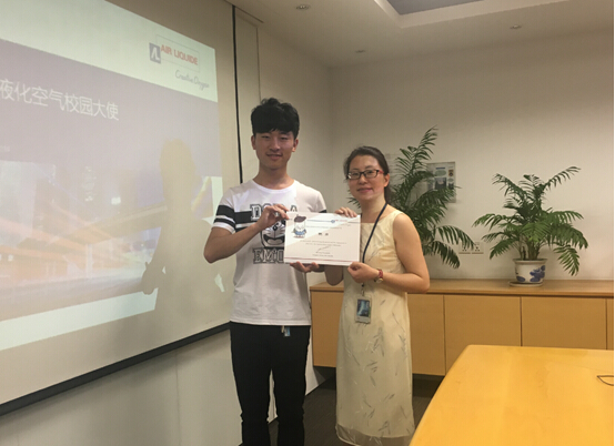 企业培训师为陈岗同学(左)颁发液空校园大使证书