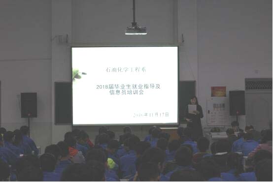 为了引导同学们走向更好的工作岗位,实现自身价值,11月17日晚,石油化学工程系在西阶三组织开展“2018届毕业生就业指导及信息员培训大会”。系党总支副书记唐蓉萍、辅导员于爱平出席了此次大会,15级班主任和100余名学生参加了会议。