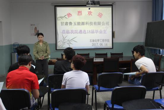 6月14日下午,甘肃鲁玉能源科技有限公司人事部殷紫荷在石化楼309会议室举行了企业招聘宣讲会,石化、应化等院校相关专业的2018届毕业生加了此次企业宣讲会。