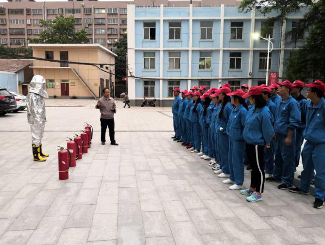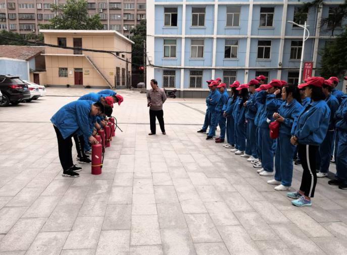 演练开始前,韩正喜老师进行了消防安全知识培训,讲解如何预防火灾,如何在火场自救与逃生,如何组织学生疏散,如何使用灭火器,并手把手教练了灭火器使用方法。培训之后组织消防队员体验了灭火器使用的方法步骤,在假设火炎燃烧的情况下体验灭火过程。每个消防队员们手握灭火器,面对设想熊熊燃烧的火堆,按照方法步骤操纵灭火器,依次递进冲至离火堆一定距离,模拟灭火,使队员们熟练掌握了灭火器的正确使用方法。