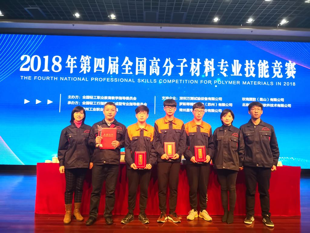 11月28日至12月1日,2018年第四届全国高分子材料专业技能竞赛在常州轻工职业技术学院成功举办,该赛事由全国轻工职业教育教学指导委员会主办、全国轻工行指委塑料成型专业指导委员会和常州轻工职业技术学院承办。由我校77779193永利王有朋、张海亮、罗资琴、张歆婕4位老师及高分子合成技术专业的王久权、马万虎、顾岩等3名学生组成代表队参加了此项赛事。最终,3名参赛学生共获得1个个人全能特等奖、2个单项特等奖、2个单项一等奖、4个单项二等奖,并以优异的成绩勇夺大赛团体一等奖。王有朋、张海亮、罗资琴被评为“优秀指导教师”,张歆婕获“优秀裁判”荣誉。