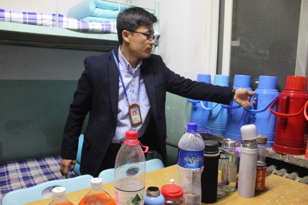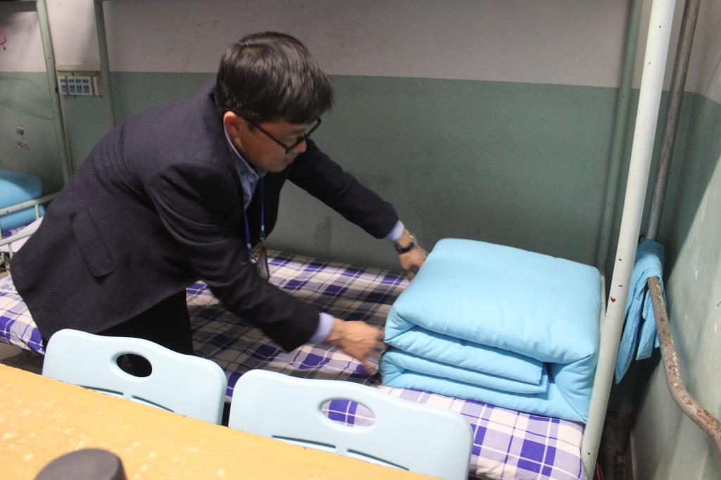 赵立祥在实华公寓二楼宿舍进行检查,以学校宿舍卫生管理办法为参考标准。首先是整体上干净整洁,桌凳、水壶、卫生工具摆放整齐;同时在细节上也同样注重,毛巾摆放位置,被子要有棱有角,同军被一样要求。对于床底脸盆、鞋的摆放,垃圾桶里、角落垃圾也逐一检查。赵立祥对宿舍水壶摆放不当的进行正确摆放;在检查被子时对没有棱角的被子进行适当修正,以及对细小垃圾进行清理。在检查中,宿舍基本保持我院对宿舍卫生管理要求,物品摆放规范,垃圾勤倒,地面无垃圾纸屑,保持宿舍通风,但是在一些细节上处理不是很完美,仍由需要改正的地方。