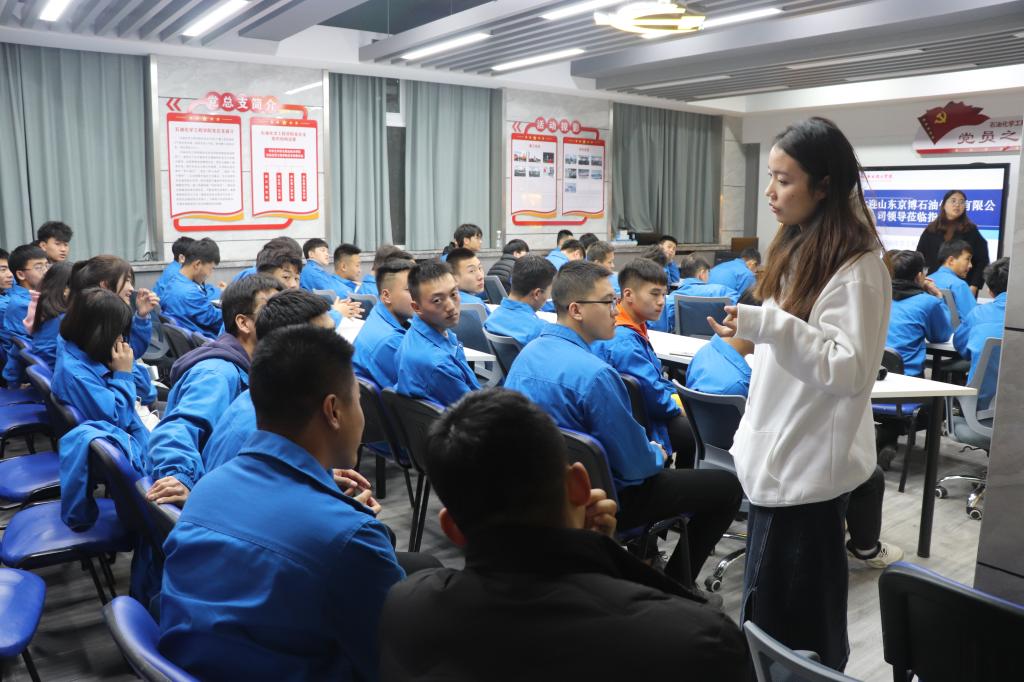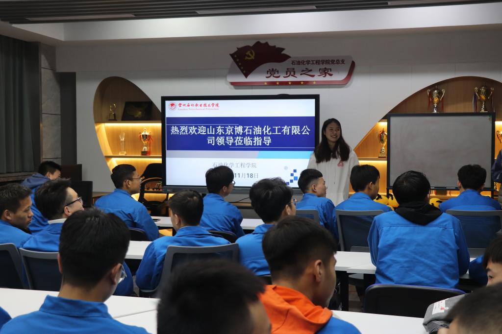 活动中,公司领导为同学们播放了一个小短片,记录了18级学长学姐们在公司工作的经历与感受。随后,为各位同学宣讲了他们公司的基本待遇情况、假期制度、薪资待遇、公司母子女安排、住宿伙食情况等。在宣讲过程中,同学们认真听讲,现场气氛十分活跃,并不断地提出关于公司制度的疑问。在宣讲完毕后,还有一位18级的学姐为同学们讲解了她到京博石化的经历,同学们也十分积极地提出了一些关于就业的问题,同时对京博石化产生了浓重的兴趣。