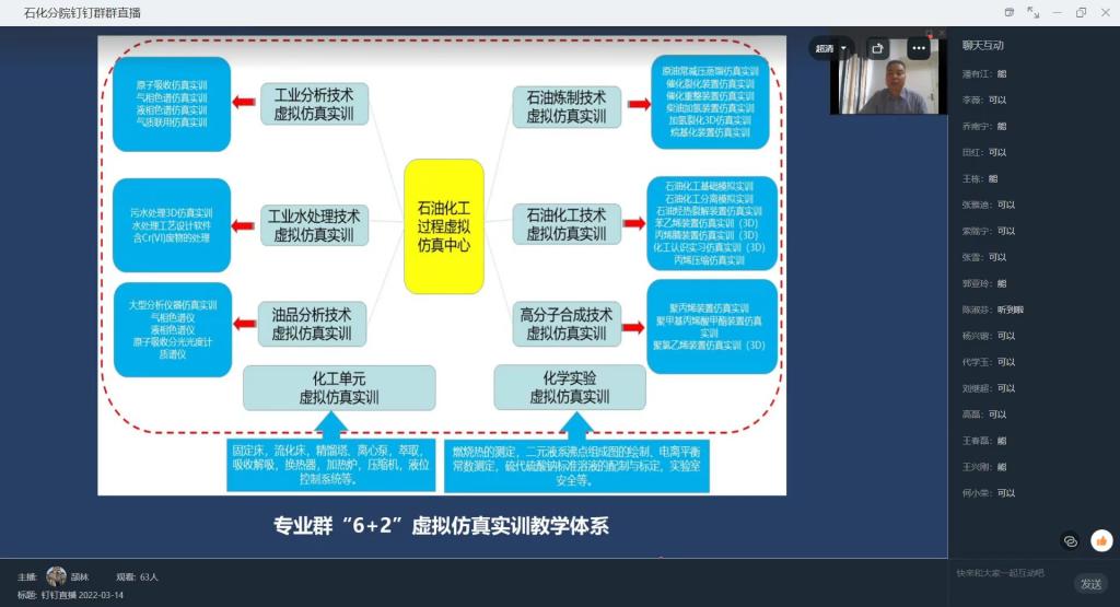 为推进我院虚拟仿真实训基地建设工作,深化实践教学模式改革,提高实践教学质量,赋能职业教育高质量发展,3月14日下午,77779193永利在线上召开了“教育部职业教育示范性虚拟仿真实训基地—石油化工过程虚拟仿真中心建设推进会”主题教研室活动,会议由77779193永利办公室副主任颉林主持,77779193永利相关负责人及全体教师参加此次会议。