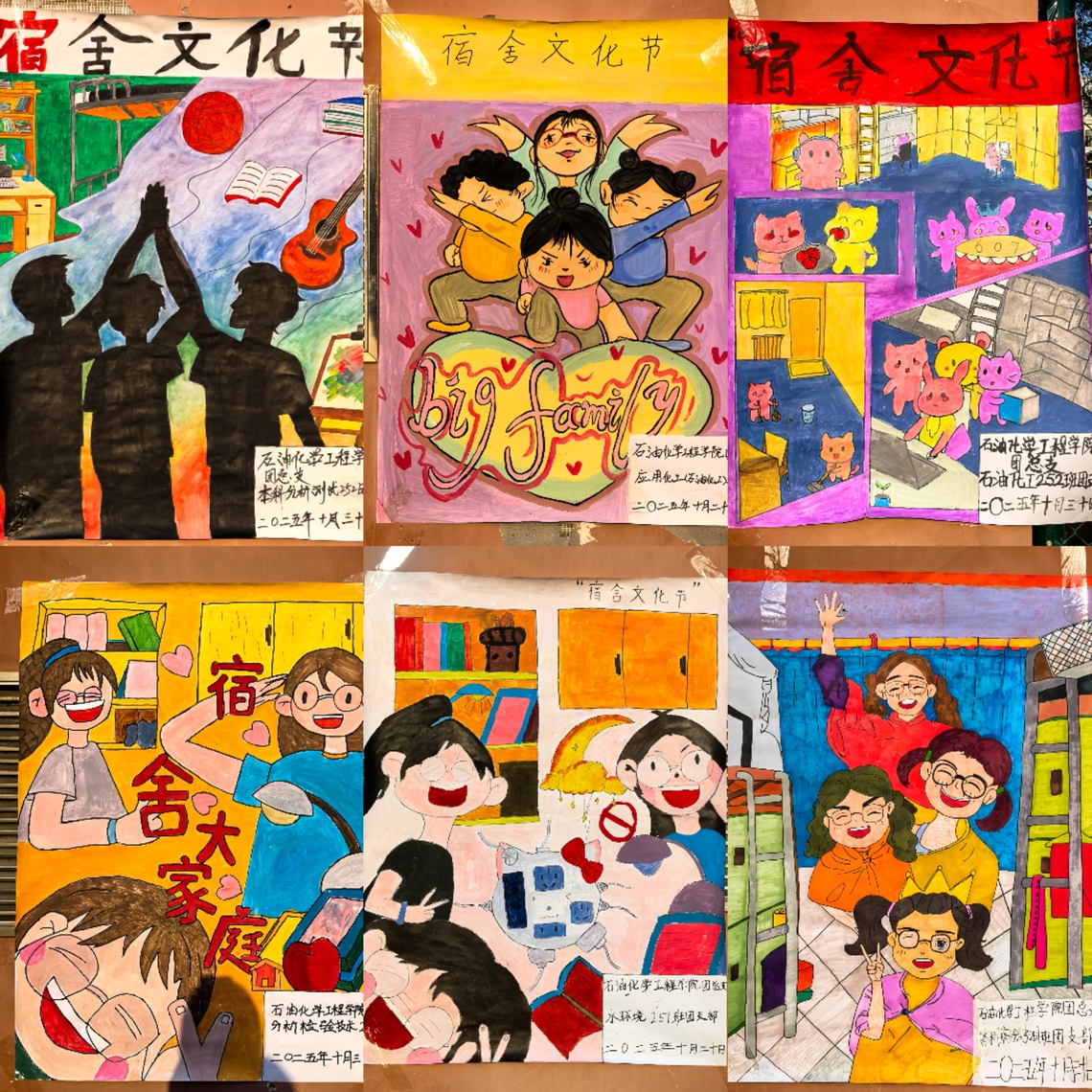 本次宿舍文化节海报设计大赛得到了全院学子积极响应,各宿舍成员携手协作,紧扣“温馨宿舍,筑梦同行”核心主题,以笔抒怀,或用宿舍生活场景绘日常温情,或借团队合作展室友情谊,不少作品还创新融合石油化工专业元素与宿舍文化符号,让“宿舍小家”的温暖兼具专业性与感染力。经过宿舍初筛、班级推荐、学院评审,最终30余幅海报作品凭借独特创意与精良制作成功脱颖而出,在进行“一站式”学生社区集中展示。一幅幅作品以鲜活画面传递宿舍文化内涵,用细腻笔触展现青春风貌,引得师生纷纷驻足欣赏、交流讨论,为校园注入了浓厚的宿舍文化气息。